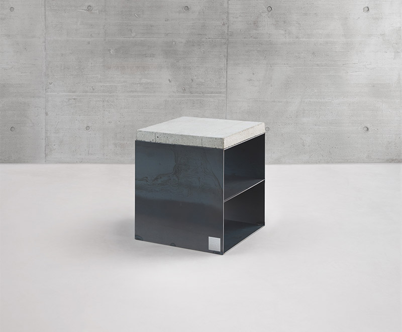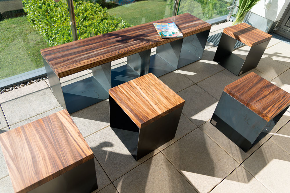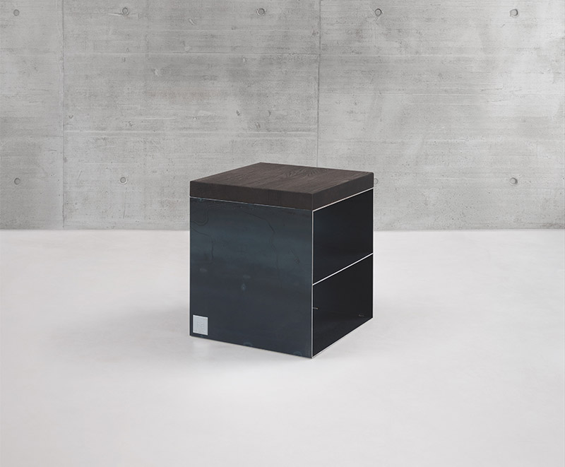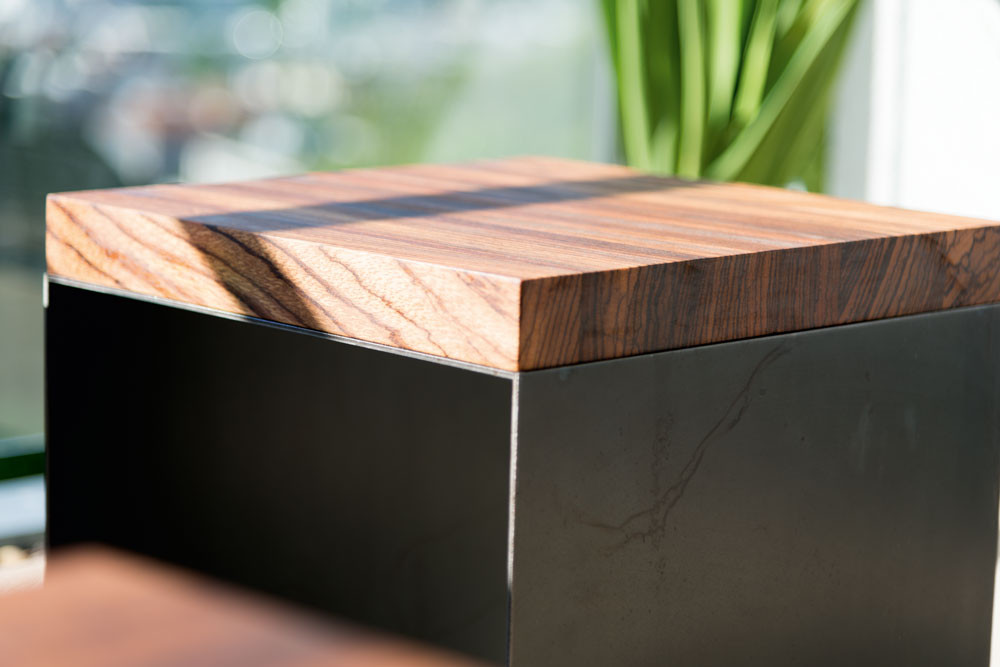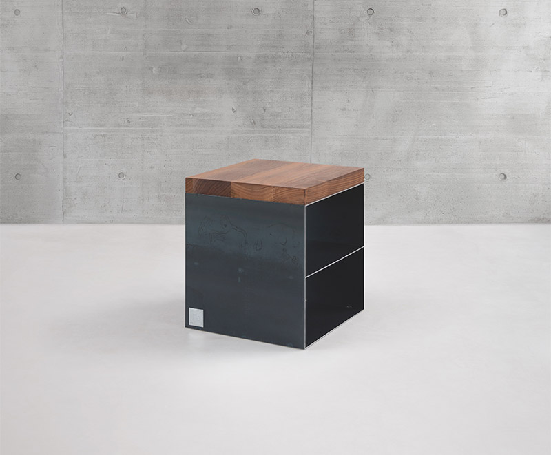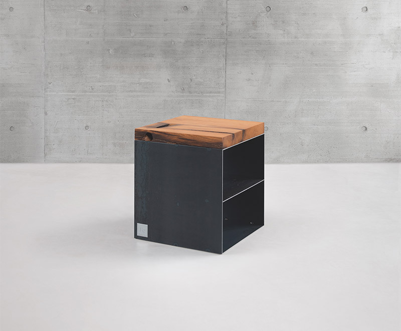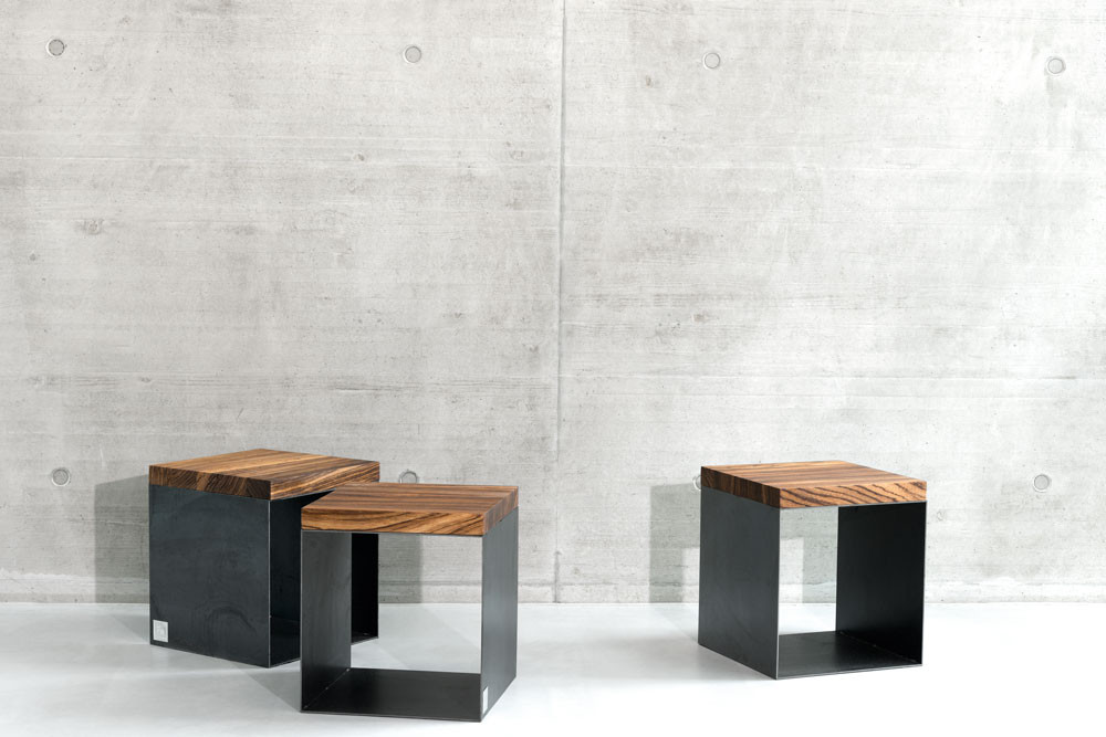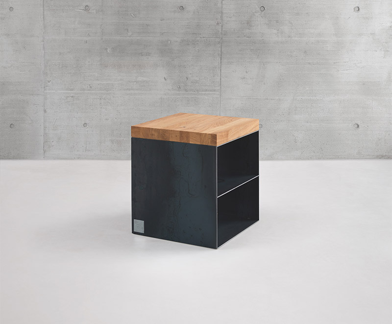 Cubes aus Schwarzstahl. Als Beistelltisch oder Sitzgelegenheit nutzbar. Massivholzplatte aus Eiche rustikal, Alteiche, Eiche geflamed, Nussbaum oder Beton.